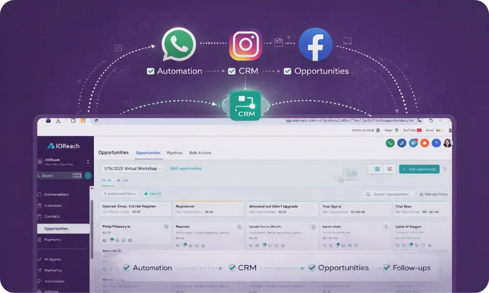 مع AIOReach كل أدواتك تعمل معًا في منصة واحدة، مما يقلل التعقيد، التكاليف، ويمنحك رؤية شاملة لأعمالك.