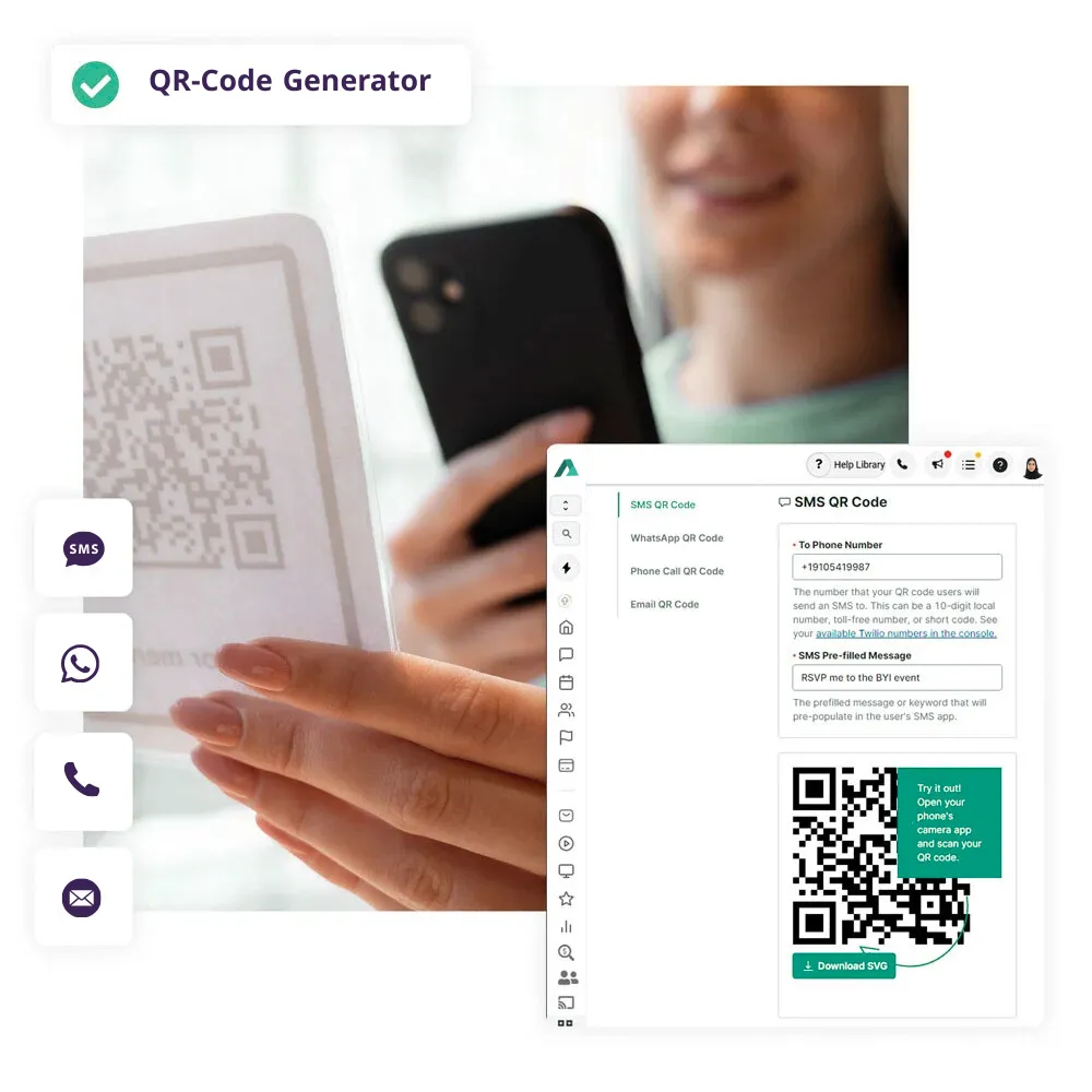 حوّل رسائلك إلى تجربة فورية. أنشئ رمز QR يرسل رسالة نصية جاهزة إلى أي رقم هاتف بمجرد المسح.